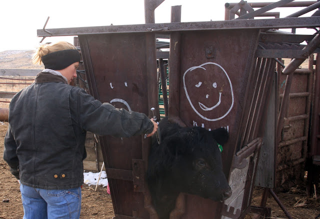 I didn't get a photo of doctoring any calves this year, but here's an example of my aunt giving a shot. She's going to give it in the neck, and you also want to be careful not to break the syringe (the clear part is glass), and waste the vaccine. She was giving a shot to some cows, and that's why it's white. LA 200 is the color and consistency of maple syrup. It's sticky, thick, and some brands burn when you give the shot to the calf. But, it's also fast and long-acting, effective, and a much better alternative to not being doctored.